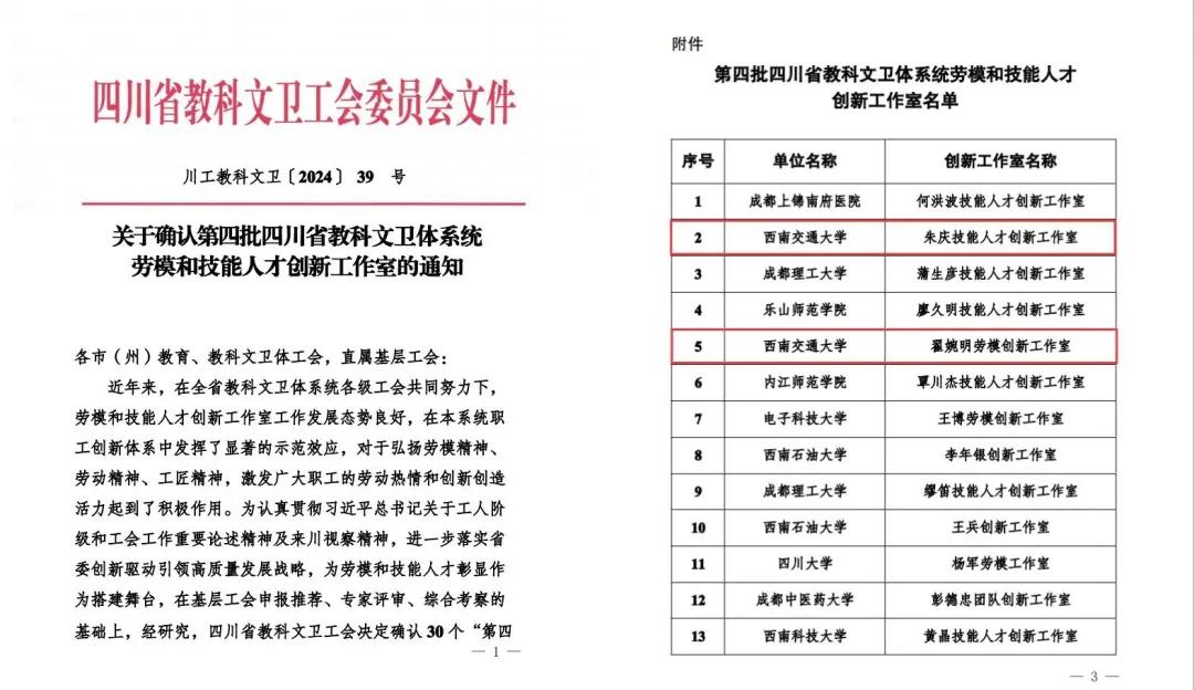 12月10日,四川省教科文卫工会下发《关于确认第四批四川省教科文卫体系统劳模和技能人才创新工作室的通知》,在基层工会申报推荐、专家评审、综合考察的基础上,决定确认30个“第四批四川省教科文卫体系统劳模和技能人才创新工作室”,18H