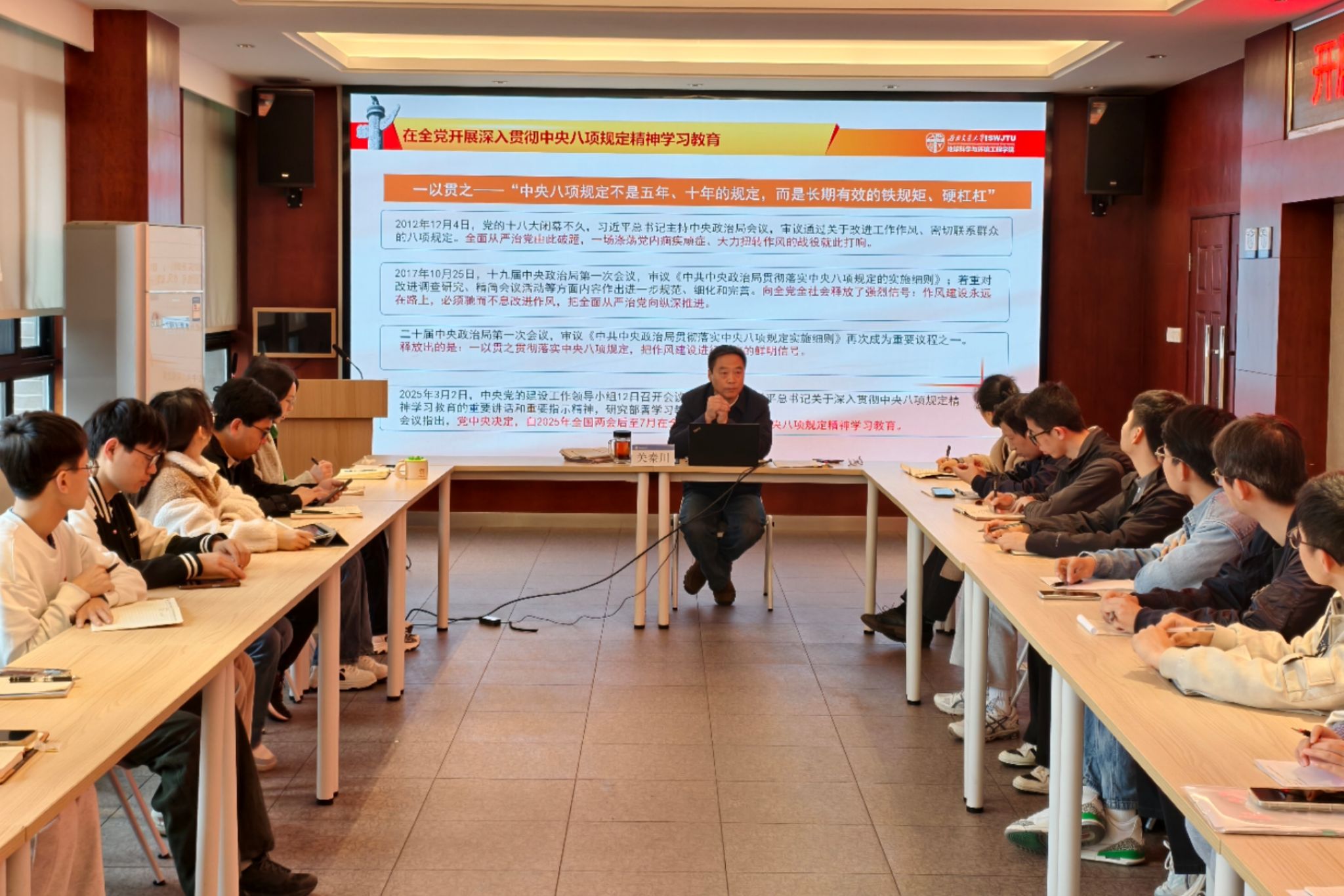 党委在X4520会议室召开深入贯彻中央八项规定精神学习教育启动部署会暨专题党课,此次大会由学院专职组织员李晓宇主持,学院党委书记关秦川主讲,学院全体教工、学生党支部书记参与此次会议。