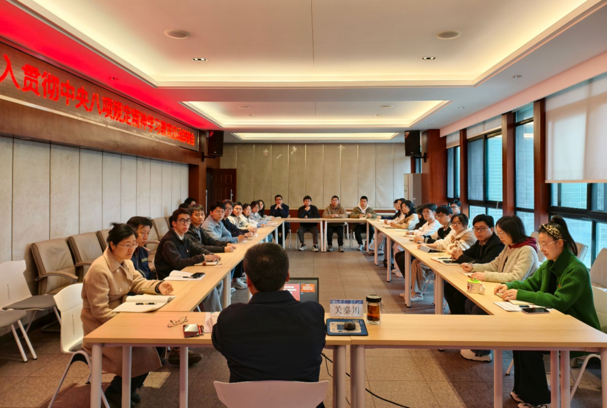 最后,关书记传达布置了校党委及学院党委关于深入贯彻中央八项规定精神学习教育的工作安排,要求各党支部要从学习研讨、查摆问题、集中整治、开门教育等方面认真落实相应的工作清单。尤其要紧密结合2024年学院党委在巡察整改中的重点工作,在学中知敬畏、在查中找差距、在改中见实效,一体推进学查改,确保学有质量、查有力度、改有成效。