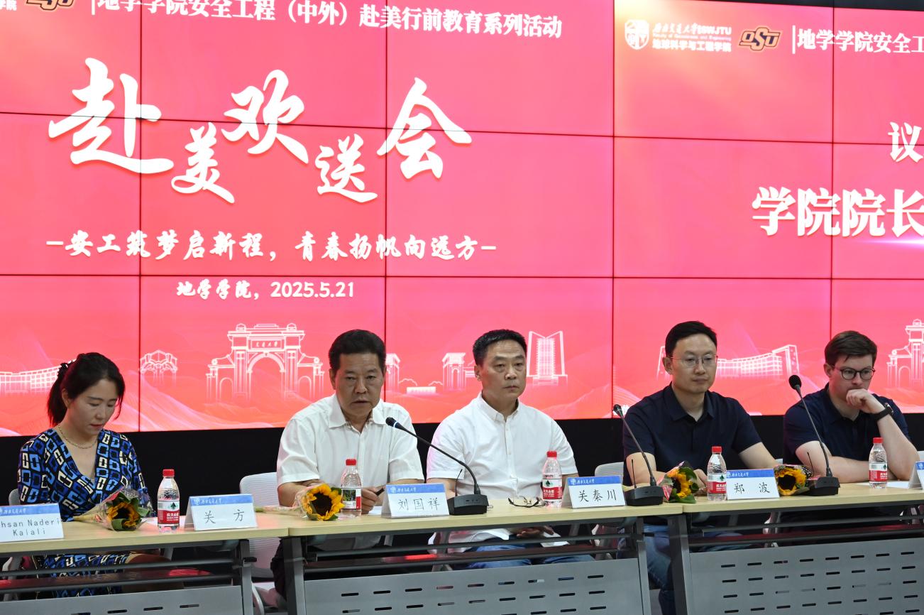 犀浦校区的榕树在暖风里舒展着新叶,一场满载祝福与期许的欢送会,就在这酝酿着丰收与离别的时节,于校园里悄然拉开帷幕。2025年5月21日晚7点,2022 级安工出国系列活动之 “安工筑梦启新程,青春扬帆向远方” 赴美欢送会在X4243举行。党委书记关秦川、院长刘国祥、党委副书记郑波、合作办学项目主管关方、项目教学主管刘静、专任教师 Ehsan Naderi Kalali 、Jamie F. Townsend ,以及项目部的郑容、陈茜、牛小会、干敏,辅导员孙惠敏以及22级安全工程(中外)全体同学参与本次活动。本次欢送会由22级安全工程(中外)专业学生马健迅主持。