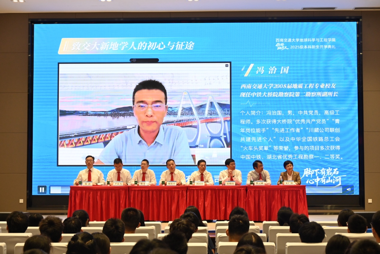 学院2008届地质工程专业冯治国校友发言。他向同学们分享了二十年前,自己在这所满是“铁路基因”的校园里的探索和成长,以及工作后在参与国家重大工程中对于地质专业的深刻理解。他表示,交大地质专业不仅是一门“脚踩泥土”的真学问,更是扎根中国基建、守护工程安全的实践沃土。他鼓励同学们扎实学好理论、珍惜野外实践、拓展跨学科视野,在交大找到自己的方向,带着“交大地学人”的底气,在祖国的山川大地上,走出属于自己的路。