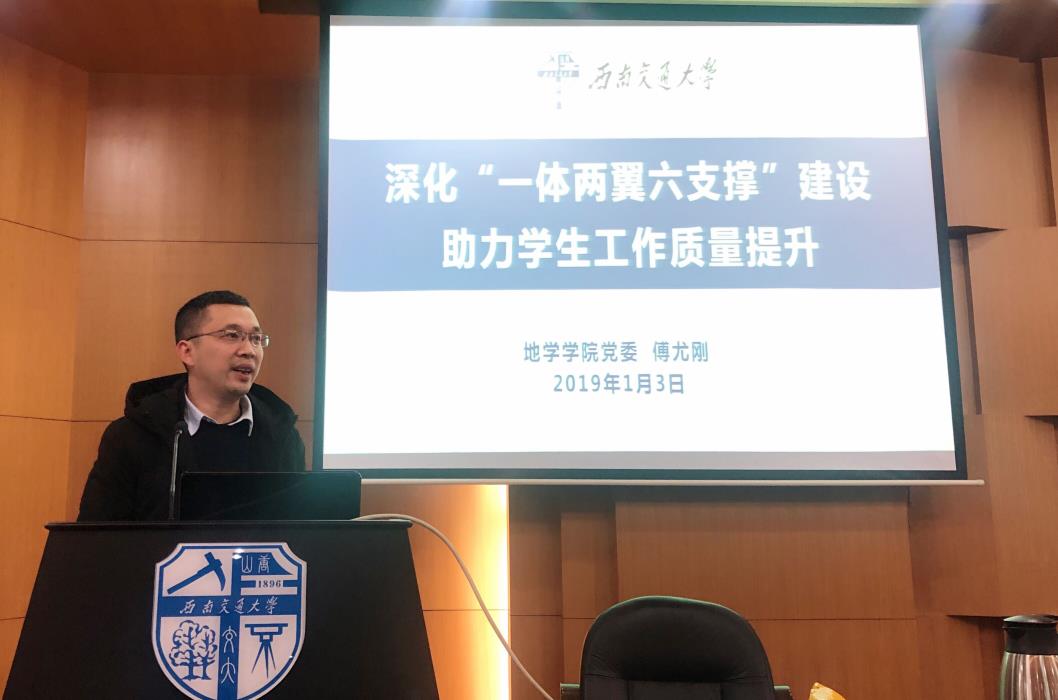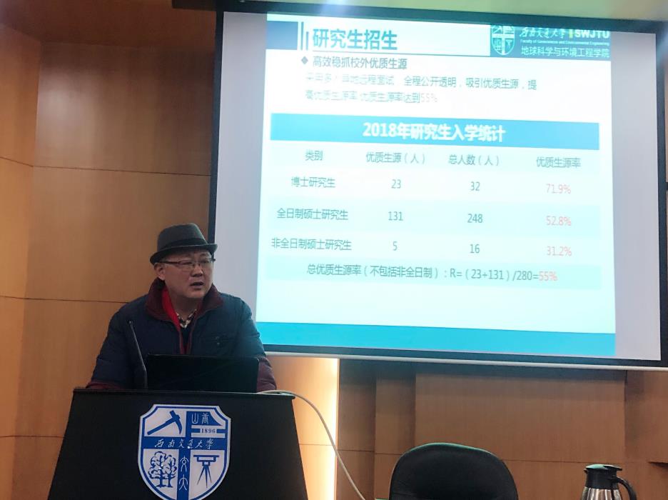 2019年1月3日,地球科学与环境工程学院于图书馆二号报告厅召开2019年第一次全院教职工暨中层领导干部述职大会,参加会议的有学院党政领导班子,全体教职工。大会由学院党委书记王齐荣主持。