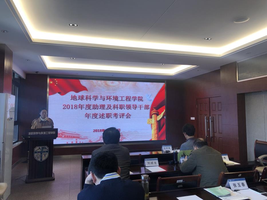 12月27日,地球科学与环境工程学院 2018年度助理及科职干部年度述职考评会在X4520会议室举行,参加会议的有院长刘国祥、党委书记王齐荣,学院党政领导班子成员、各系系主任,以及行政、教务、辅导员代表。会议由学院党务秘书李晓宇同志主持。