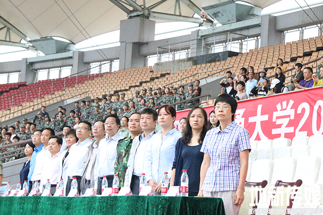 校党委副书记徐飞校长、校党委常委蒲云副校长、校党委常委冯晓云副校长、校党委常委沈火明、军训团周团长,党委办公室主任甘灵,校长办公司主任钟冲,党委学生工作处部长高平平,教务处处长郝莉,计划财务处处长陈岩峰,后勤保障处处长关秦川,采购与招标管理办公室主任杜红,资产与实验室管理处副处长董艳云出席典礼。承训教官、部分教师、辅导员以及2017级参训新生参加了典礼。