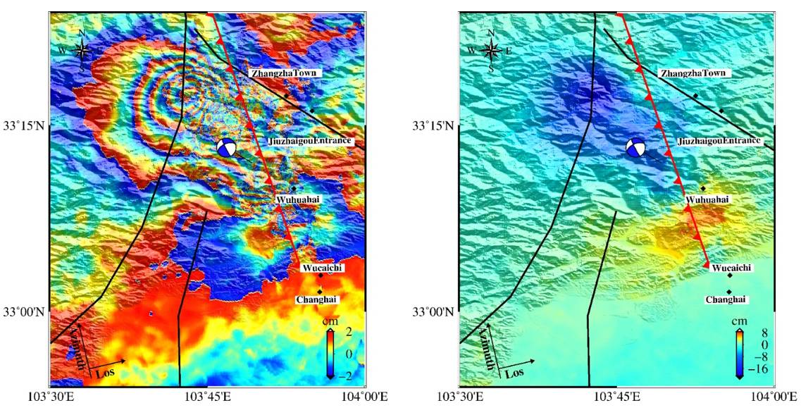 和西南石油大学从事遥感研究的专家学者和博士生组成的专门工作组,成员包括陈强教授、杨莹辉博士、王晓文博士、张瑞博士、贾洪果博士、于冰博士和博士生武帅莹、蔡嘉伦、师悦龄、徐倩、张一君、刘先文以及硕士生赵雪、梁清粼等,由刘国祥教授做总体技术负责与工作安排。工作组主要使用高分辨率光学遥感和合成孔径雷达干涉(InSAR)遥感等技术对地震所造成的大范围地表位移、景区损毁和滑坡情况等进行了监测与分析,并对此次地震滑动断层的几何物理模型进行了反演与分析。