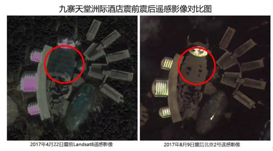 ▲图4. 九寨天堂洲际酒店震前震后遥感影像对比(房顶垮塌)