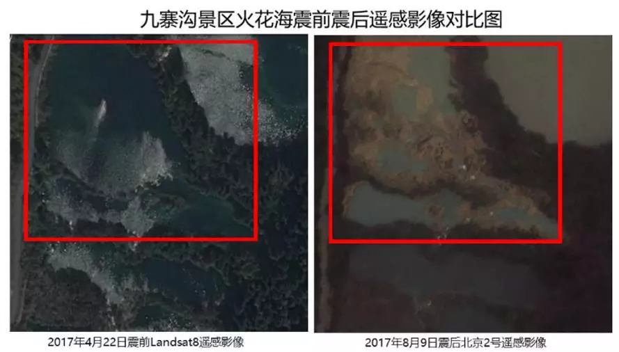 ▲图5. 九寨沟景区火花海震前震后遥感影像对比(震后水面浑浊,部分水域干涸见底)
