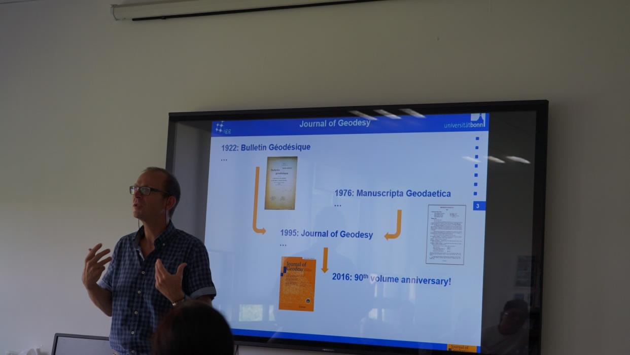 接下来,Kusche教授介绍了《Journal of Geodesy》杂志的相关情况,该杂志创刊于1922年,1995年改名为Journal of Geodesy,20名编辑(editor)均是来自世界各地的顶级专家,稿件录用率约35%,中国学者的投稿量相对其他国家最多,2016年IF为2.949,是大地测量学期刊的最高IF,从录用到online只需18天,目前下载量为143109,有147篇文章被社会媒体平台讨论或报道。