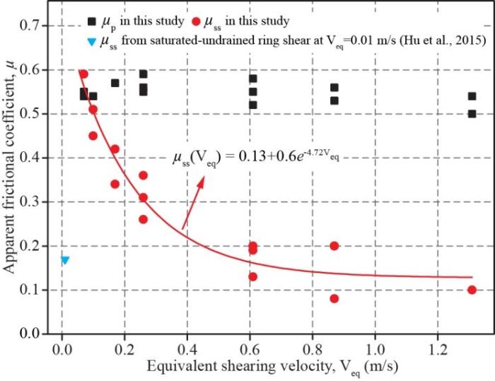 滑坡底部相试样等效摩擦系数之速度相依弱化特性