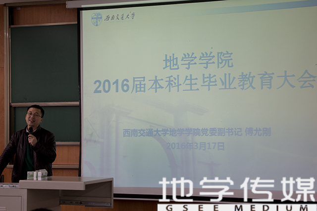 党委副书记傅尤刚老师在主讲。大会旨在动员我院大四学生积极规划生涯前景、树立正确的人生观、价值观,提升同学们遵纪守法及安全防范意识。