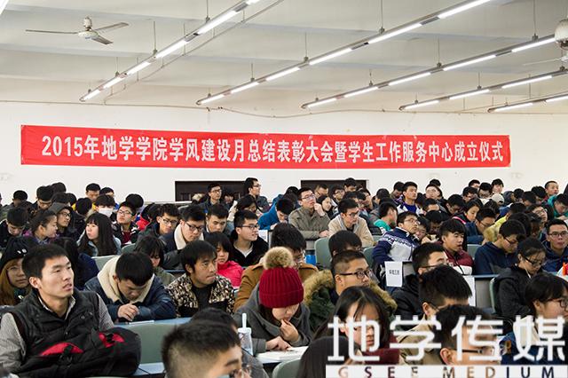 在X2321教室召开2015年学风建设总结表彰大会暨学生工作服务中心成立仪式。出席本次大会的嘉宾有我院党委副书记傅尤刚老师,团委副书记王静雅老师,2014级辅导员杨都强老师,团委副书记孙彦文老师,兼职辅导员司有亮老师,会议由司有亮老师主持。