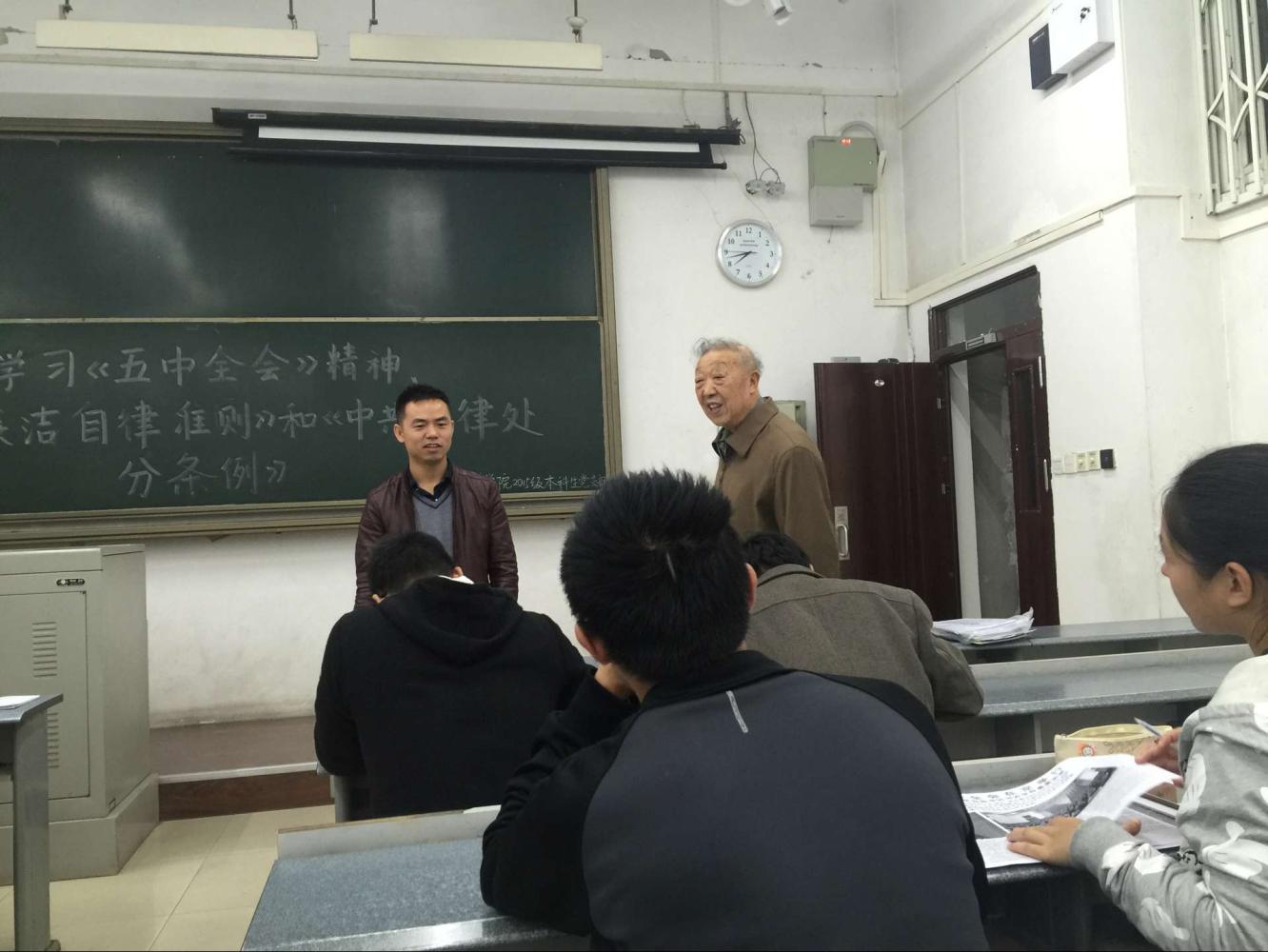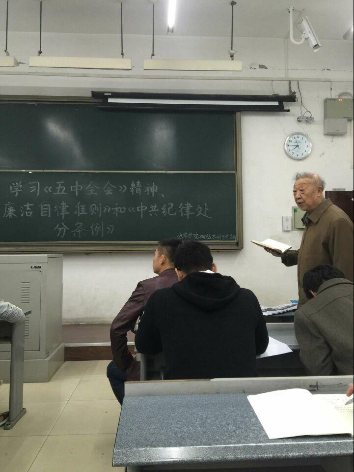 2015级本科生党支部成员在X7101召开“懂规矩,守纪律”主题活动——学习十八届五中全会精神、《中国共产党廉洁自律准则》和《中国共产党纪律处分条例》。会议邀请到了组织员刘冠军老师,党支部书记孙彦文老师主持会议。