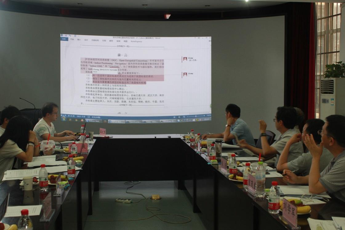 、南京师范大学、浙江大学、天地图有限公司、武汉大学等单位的专家及课题组成员就“全息位置地图参考模型”、“室内位置传感网定位服务接口”和“室内多维位置信息标识语言”三个标准规范(征求意见稿)的条款进行了深入细致的讨论和修改完善,取得了预期成果。我院朱庆教授应邀作为专家参加了此次会议。