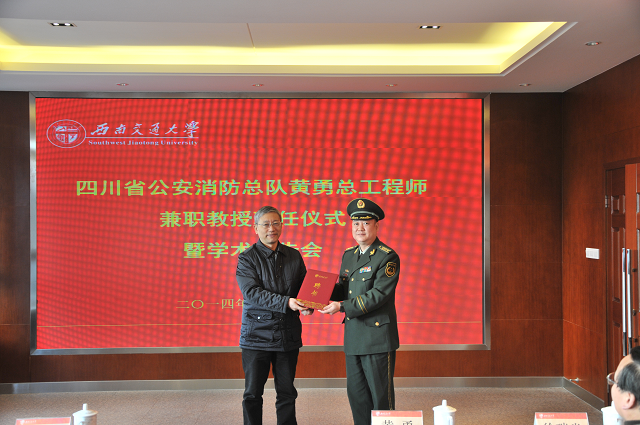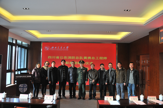 聘任仪式于10点准时开始,首先由地球科学与环境工程学院副院长胡卸文教授介绍黄勇总工程师的简历:黄勇是四川省公安消防总队总工程师、大校。四川省消防学科学术带头人,四川省消防标准专业技术委员会主任委员,四川省公安现役部队工程系列中级专业技术资格评审委员会主任评委,四川省科学技术进步奖评审委员。他长期从事消防监督管理、科技工作,有丰富的实践经验和系统坚实的专业理论基础。参与和完成科研项目多项,参编国家、行业、地方标准9部,发表专著1部,学术论文20余篇。主持的《汶川地震灾区过渡安置消防安全研究及应用》项目获得四川省科学技术进步一等奖。为四川省乃至全国的消防事业推进发展做出了卓越的贡献。