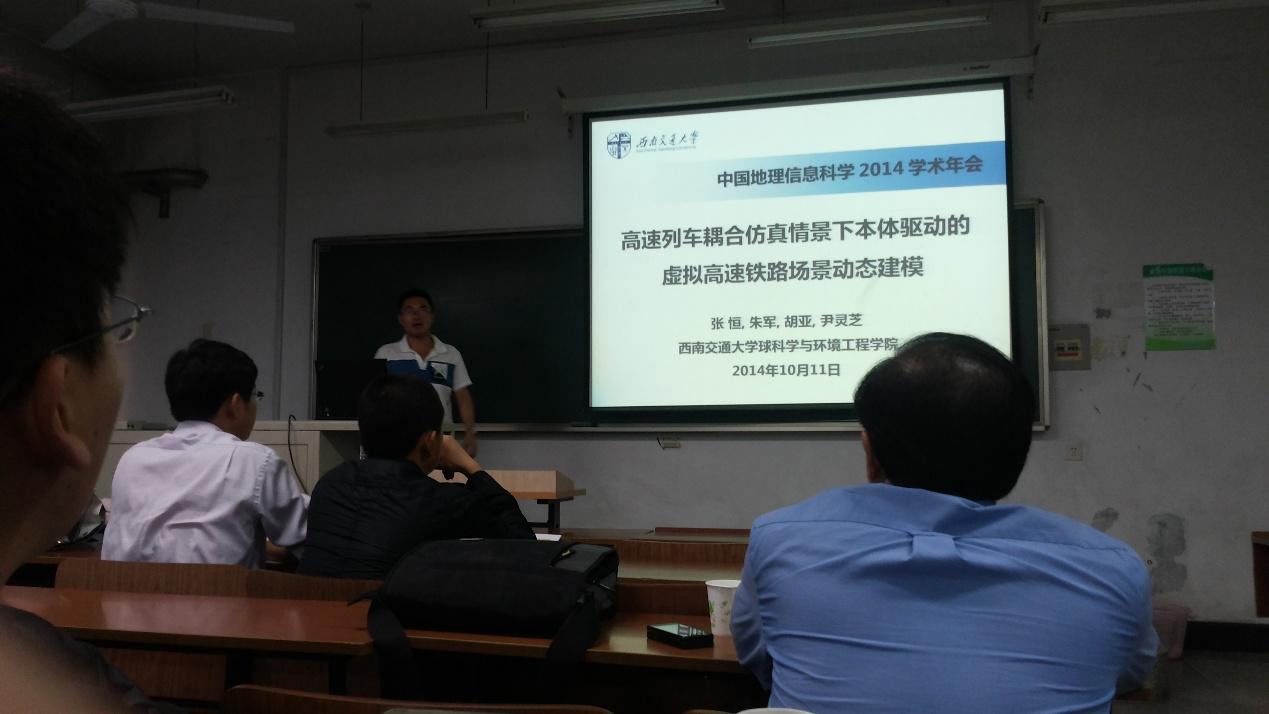 张恒、尹灵芝、龚循强分别就“高速列车耦合仿真情景下本体驱动的虚拟高速铁路场景动态建模”、“时空过程网络可视化模拟与分析-以溃坝洪水为例”、“加权总体最小二乘抗差估计方法的比较分析”做了大会交流报告。朱军副教授应邀主持了“地理建模与模拟”分会场报告。朱庆教授与解放军信息工程大学万钢教授共同策划与组织的“虚拟地理环境”专题沙龙吸引了众多听众,被誉为是本次年会中内容最新颖、讨论最热烈的沙龙之一。