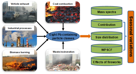 二、富Pb颗粒针对性研究:虽然大气颗粒物中Pb对于整体颗粒物质量浓度贡献很低,但因为较强的毒性而备受关注,也是颗粒物健康效应评估时不可忽视的物种。Pb通过各类源进入大气以后,可与其他类型颗粒快速混合,在此过程中,其毒性及环境和气候效应也会发生重大变化,使得对其的精确研究存在较大的不确定性。本研究在成都市四个季节分别进行连续采样,提取出富Pb颗粒,对其构成、粒径分布、季节差异及潜在源进行了全面研究,结果发现:(1)各季节的富Pb颗粒可分为8种类型,其中,与二次无机组分混合的PbNO3、PbSO4和PbSN颗粒是各季节富Pb颗粒的重要组成,贡献比例为34%~64%。(2)在二次混合过程中,相比硫酸盐,富Pb颗粒更易与硝酸盐发生混合。(3)PSCF解析可知,成都市东北、东部、东南及南部地区是该地区富Pb颗粒的重要潜在源区,然而,不同区域的贡献强度及覆盖面积在各季节差异明显。(4)春节期间烟花燃放引起了短时间爆发性的重污染事件,PM2.5的峰值浓度达到304μg/m3,而与烟花燃放有关的富Pb颗粒物如PbCl, PbM,和PbSN的贡献均明显增强。相关成果发表于Science of the Total Environment杂志(IF=5.92,中科院2区),张军科副研究员为第一作者。