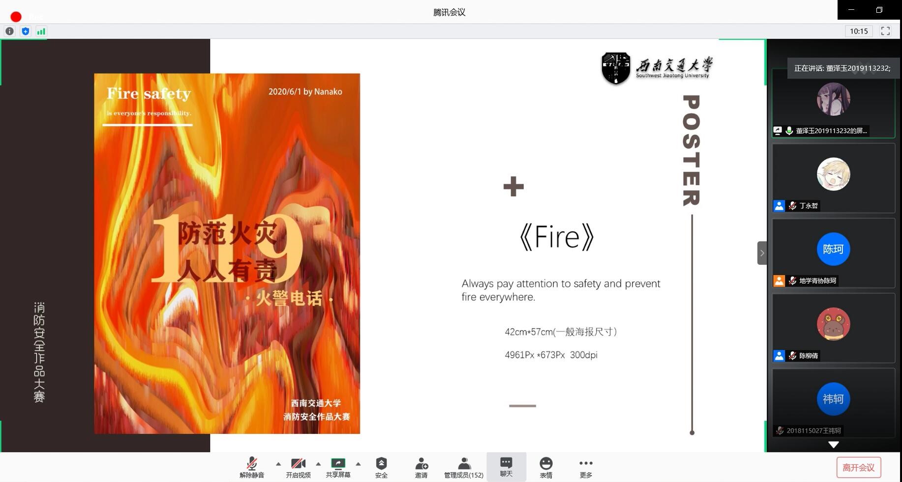 青年志愿者协会承办的“green&safety让你好好过”学生实践活动——消防安全宣传作品大赛于腾讯会议上举办决赛,并圆满落幕。