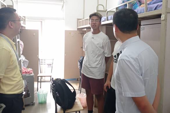 随后关秦川与傅尤刚及2020级本科生辅导员董可老师共同走访了新生宿舍,认真检查了新生宿舍所安装的设施是否符合标准,并亲切地询问了同学们对于交大的印象以及对宿舍的满意程度,最后提醒大家要注意安全用水用电和保护好个人财产,防骗防盗。