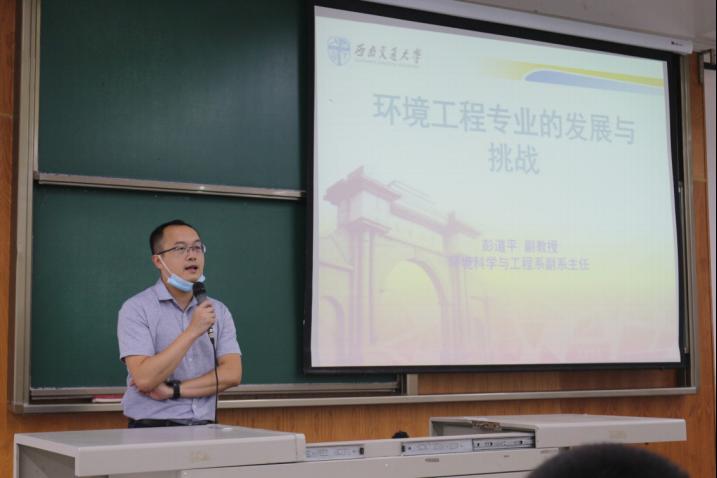 彭道平首先表达了对同学们选择本校的感谢以及对同学们未来大学生活的祝愿。接着他用“问题导向性”五个字高度概括了环境工程专业的特点,同时表明环境工程专业也具有很强的交叉性和复合性,与化学、生物、力学紧密相关。他介绍了环境工程专业的发展历程,分析了环境工程专业的就业人才与就业前景,详细介绍了环境工程专业的人才流向。 最后,彭道平告诫同学们在大学学习生活中要有积极的心态,切莫荒废时光,虚度光阴,要在大学生活中不断充实提高自己。