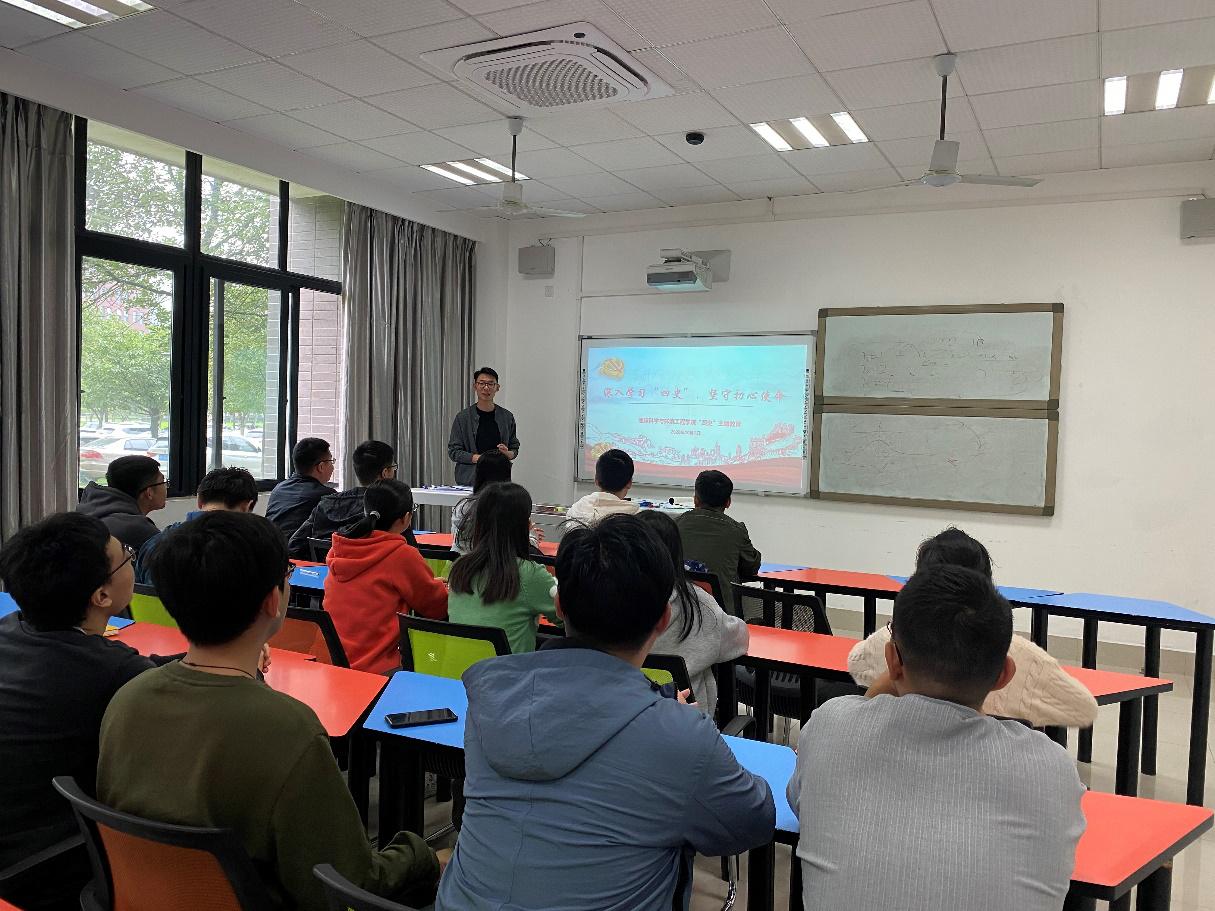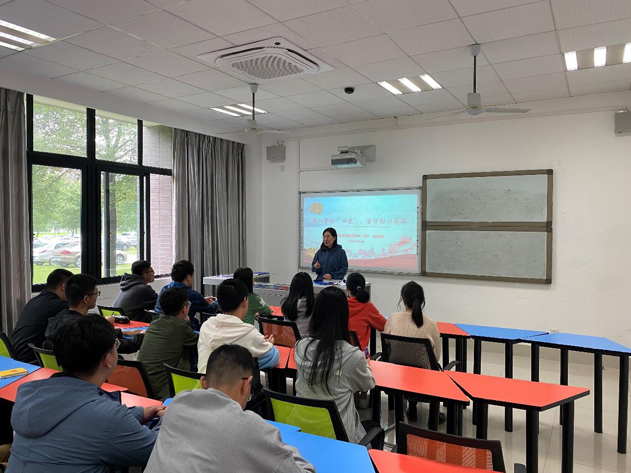 10月10日下午环境工程、消防工程专业的同学分别在x4133学四史,翟琦围绕“不忘初心,牢记使命”主题教育,讲述了“四史”是什么、为什么学“四史”。第一,什么是“四史”。“四史”就是党史、新中国史、改革开放史、社会主义发展史的结合,“四史”内容虽各有侧重,但整体讲的就是中国共产党为人民谋幸福、为民族谋复兴、为世界谋大同的实践史。第二,为什么学“四史”。知史以明鉴,查古以至今。习近平总书记指出,“只有坚持思想建党、理论强党,不忘初心才能更加自觉,担当使命才能更加坚定”。 所以学习“四史”是当代大学生必修的爱国主义教育课,让他们时刻不忘初心与使命。