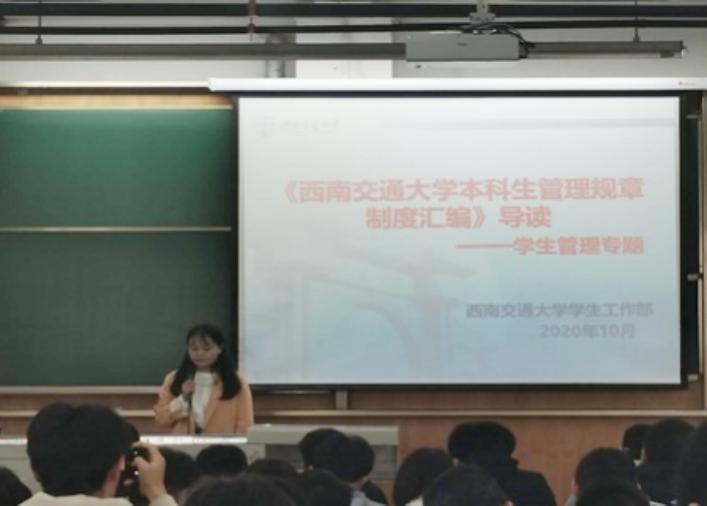 徐惟微认真介绍了我校本科生管理规章制度,重点强调了我校纪律处分相关制度,以及传达了切实解决同学问题的决心,她在现场随机调查了同学们进入大学后的变化,并提出相应的解决方法,并从生活、学习、安全、人际沟通、时间管理等方面对同学们的学习生活进行指导。