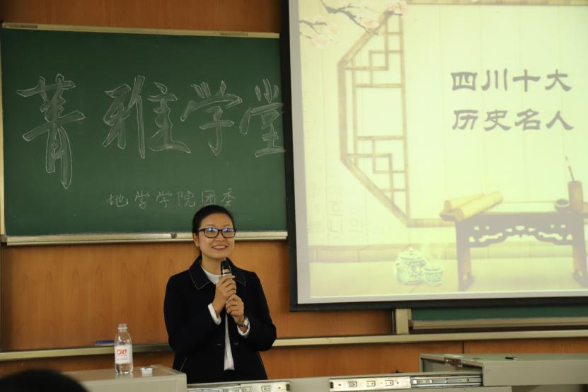 成立十周年,接着开始讲述四川十大历史名人:大禹,李冰,落下闳,扬雄,诸葛亮,武则天,杜甫,苏轼,杨慎,李白,大致介绍前九位所处的时代和主要事迹,着重讲述最后一位“千古一诗人”——李白。她播放了一段采访视频——“每个人心中的李白”,受访人从中国本土人员到外国友人,从唐诗研究领域的专家到各行各业人士,为同学们展示了李白“神”一样的存在。