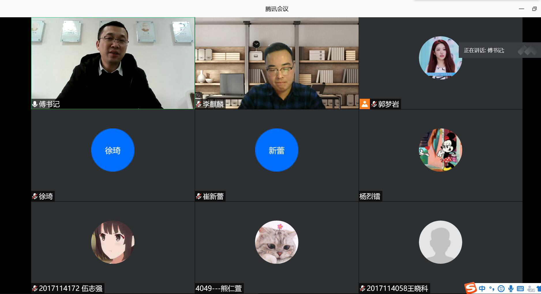 本次党日活动采用视频会议的方式在线上进行。首先,傅尤刚从当下疫情防控进入关键时刻,党员的角色的担当引入,要求党员干部以身作则,做到不恐慌、不信谣、不传谣,坚定政治立场,发挥学生党员的主心骨和模范带头作用。通过全国劳动模范孟祥连的故事,讲述优秀院友苦学专业知识,在实践中练就专业技能,在新时代建功立业,奋斗在祖国最需要的地方,勉励党员同学寻学长经验,能之苦肯转眼,脚踏实地奋斗在祖国需要的地方。最后傅尤刚希望党员同学都能梳理远大理想,将所学知识用到攻克国家发展难题之中,将个人的需要与祖国的需要结合起来,牢记党员使命,为国奋斗洒青春。