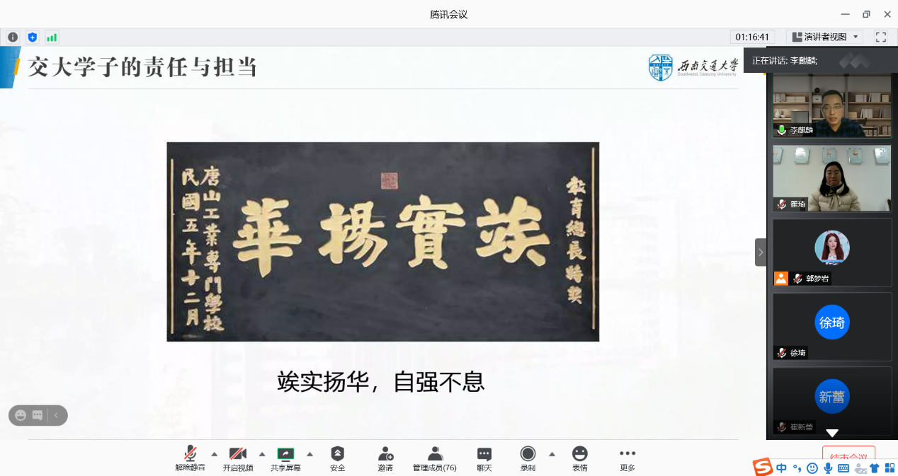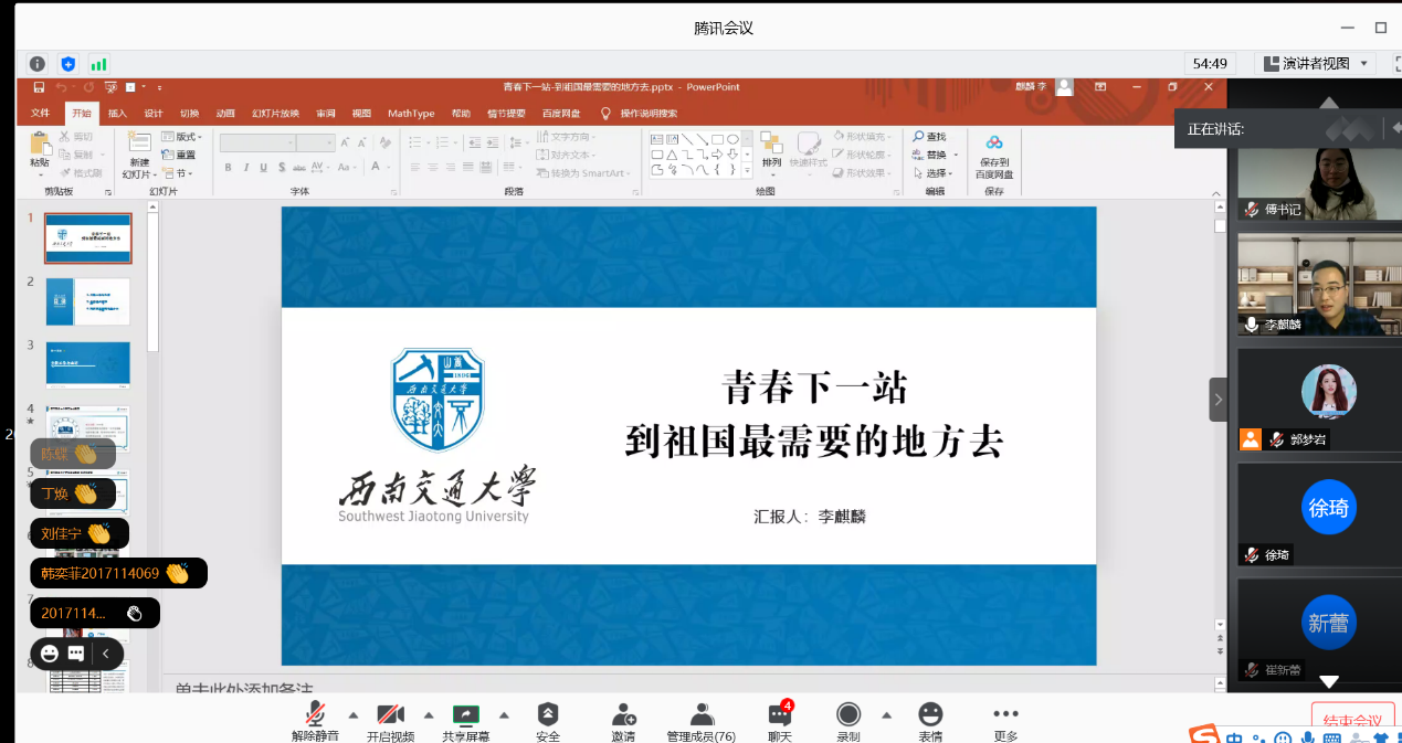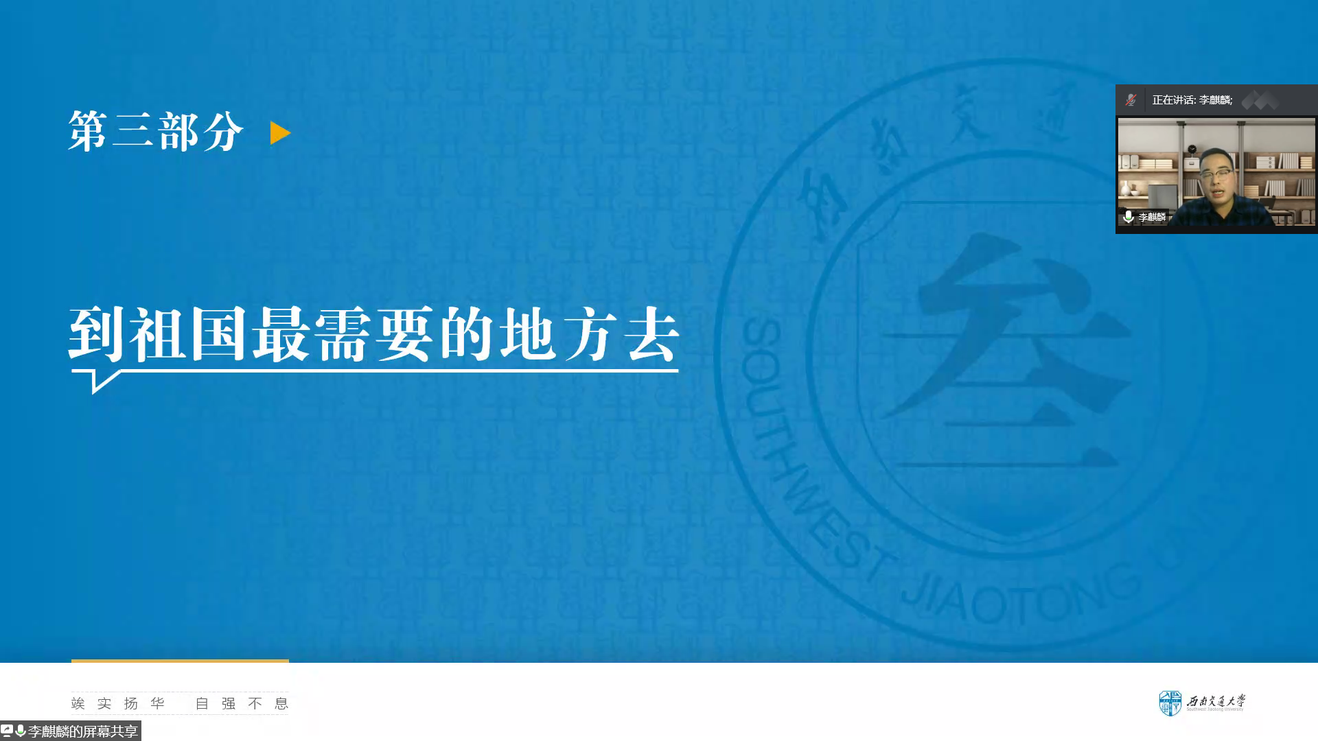 本2017级联合党支部线上开展“不忘初心 不负韶华——青春下一站,到祖国需要的地方去”主题党日活动,党支部组织员学院党委副书记傅尤刚主讲,校基层就业先进个人、研究生支教团成员李麒麟作分享。本2017级联合党支部全体党员同志、发展对象、积极分子参加活动。党支部指导老师本2017级辅导员翟琦主持。