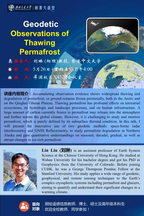 Lin Liu is an assistant professor of Earth System Science at the Chinese University of Hong Kong. He studied at Wuhan University for his bachelor degree and got his PhD in Geophysics from the University of Colorado. Before joining CUHK, he was a George Thompson Postdoc Fellow at the Stanford University. His study applies a wide range of geodetic, geophysical, and remote sensing techniques to the Earth’s complex cryospheric systems including permafrost and glaciers, aiming to quantify and understand their significant changes in a warming climate.
