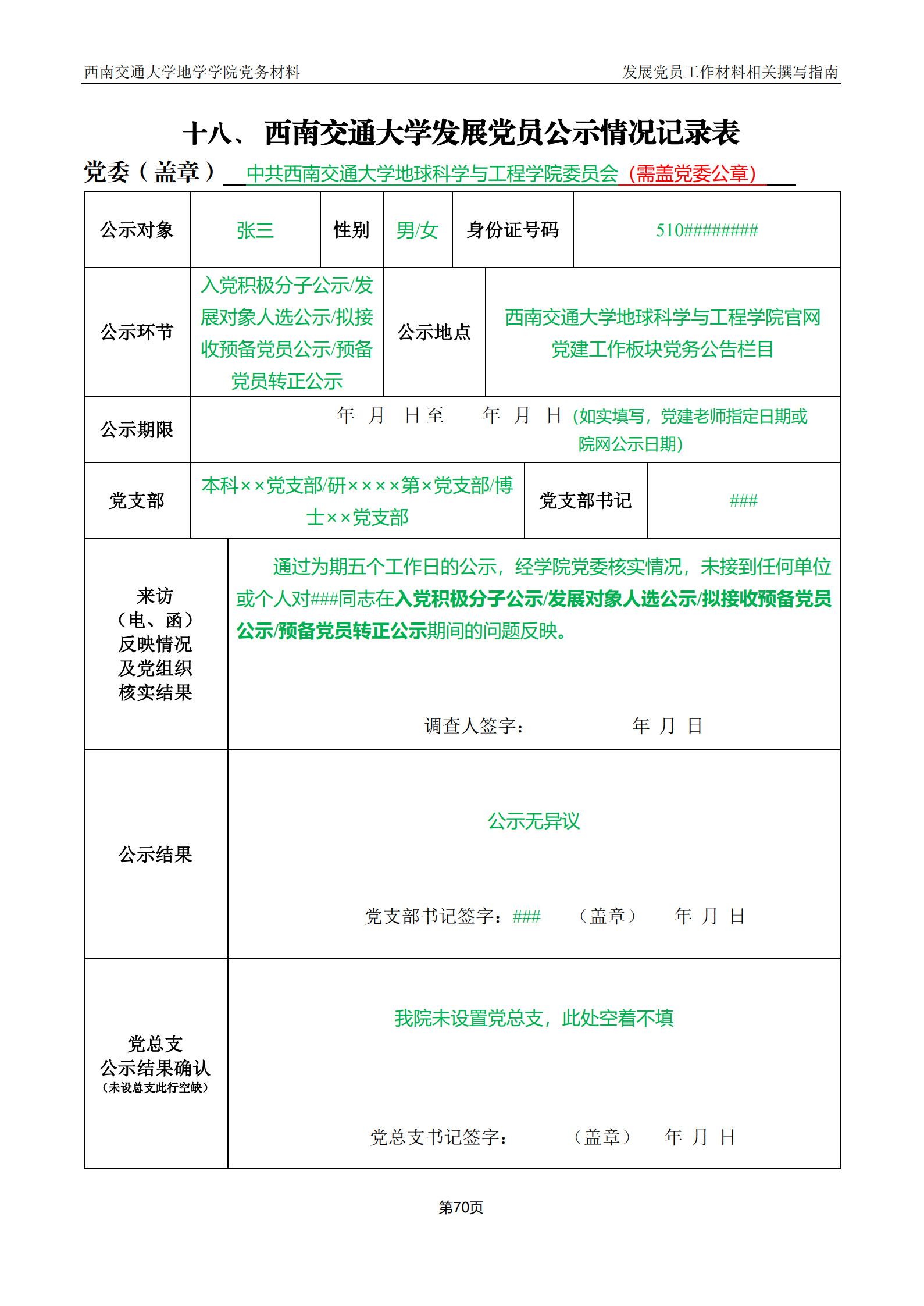 关于发展党员公示情况记录表上党委、党委盖章、公示地点应当写18H